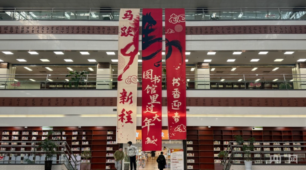走进馆内大厅,室内窗明几净、开阔大气,藏书品类丰富,“马跃新程”“图书馆里过大年”“书香迎春”等主题楹联悬挂其间,让浓厚的迎新之喜与醇厚的书香交织融合,营造出舒适、温馨的文化氛围。